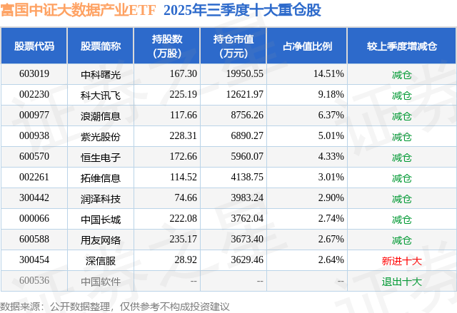 从基金规模来看,富国中证大数据产业ETF基金2025年三季度公布的基金规模为13.75亿元信通实盘,较上一期规模22.87亿元变化了-9.12亿元,环比变化了-39.88%。该基金最新一期资产配置为:股票占净值比99.07%,无债券类资产,现金占净值比1.43%。从基金持仓来看,该基金当季前十大股票仓位达53.36%,第一大重仓股为中科曙光(603019),持仓占比为14.51%。