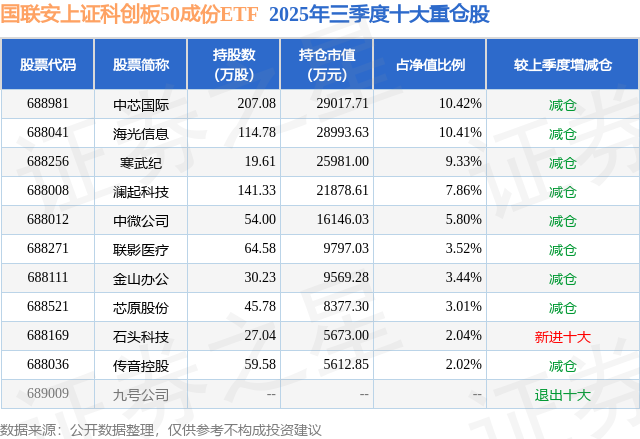 从基金规模来看,国联安上证科创板50成份ETF基金2025年三季度公布的基金规模为27.84亿元,较上一期规模32.13亿元变化了-4.29亿元本财配资,环比变化了-13.34%。该基金最新一期资产配置为:股票占净值比99.62%,无债券类资产,现金占净值比0.42%。从基金持仓来看,该基金当季前十大股票仓位达57.85%,第一大重仓股为中芯国际(688981),持仓占比为10.42%。